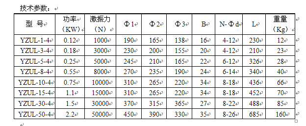 YZUL系列立式振動電機技術(shù)參數(shù):